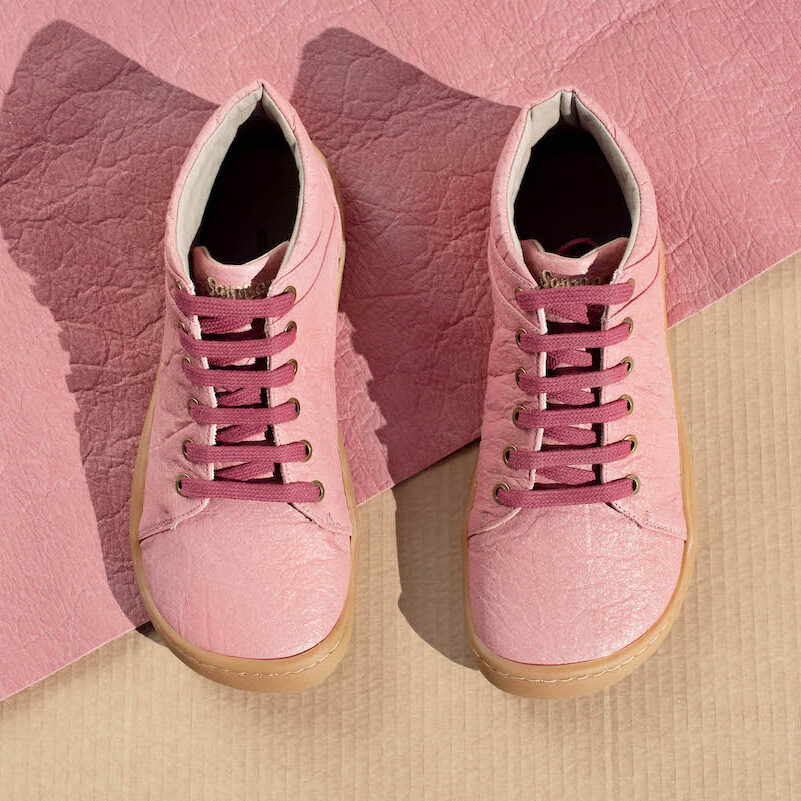 Bosonogi čevlji Original Rosa so narejeni iz Piñatexa® v roza barvi. Ta naravnen in vsestranski material je alternativa živalski koži in je izdelan iz vlaken ananasovih listov. Podloga je iz organskega bombaža barvanega z rastlinskimi pigmenti.